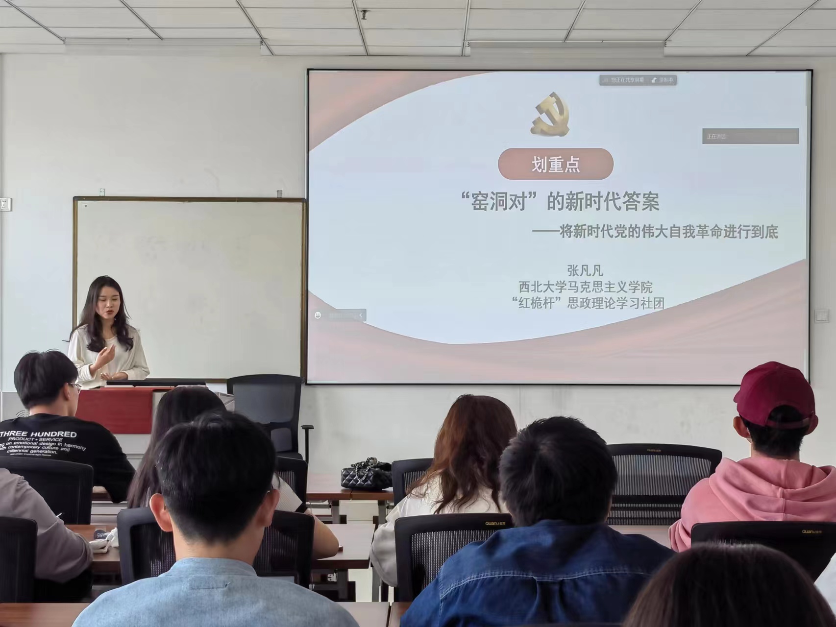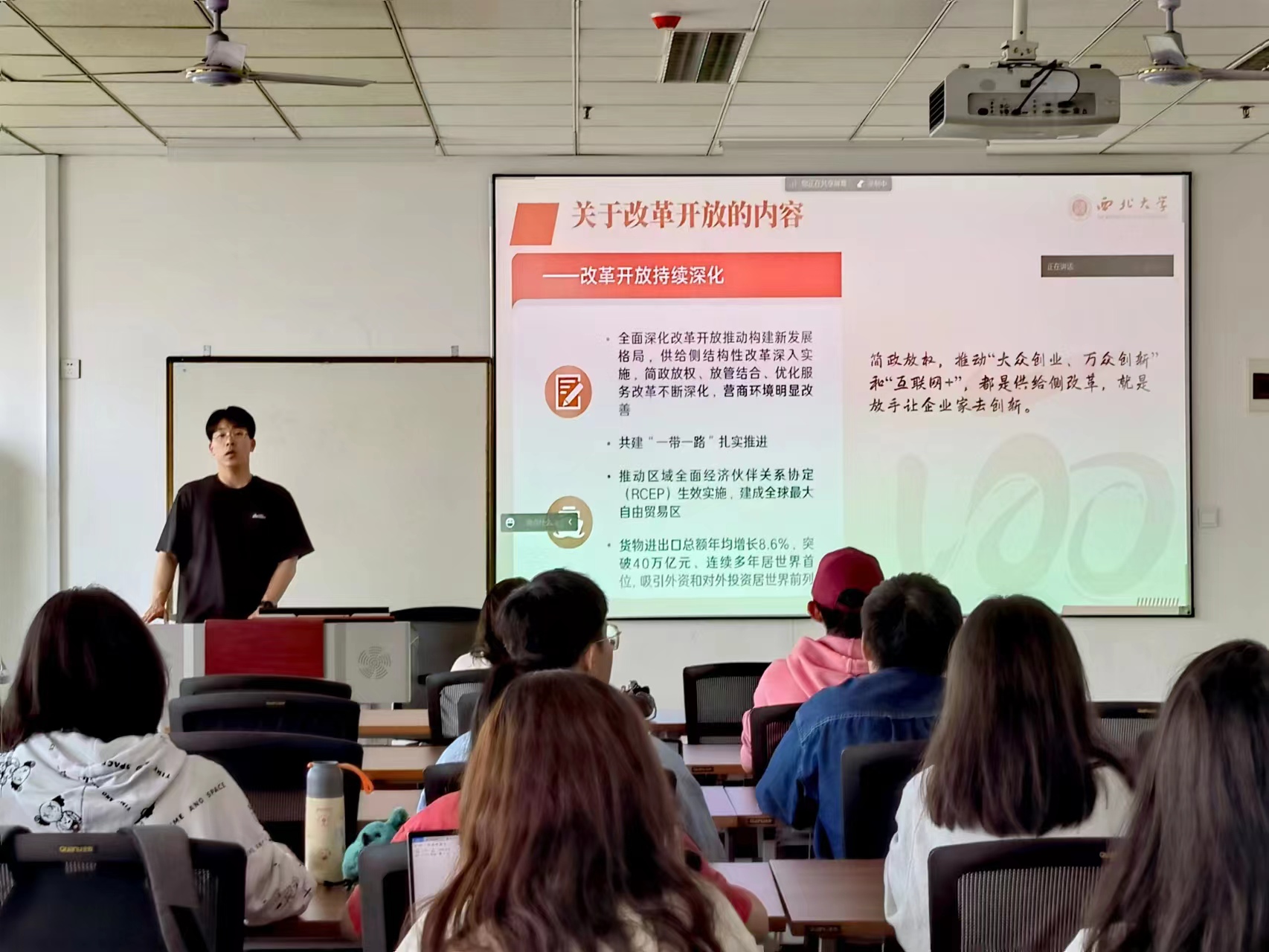 刘天霖以《二十大报告中的全面深化改革》为主题,从二十大报告原文中展开为同学们讲述了深化改革的必要性以及哲学基础,通过举例子的方式来说明改革开放前期我国如何发展经济以及现如今改革的侧重点来进行对比,使同学们了解了全面深化改革的内涵和重要性。