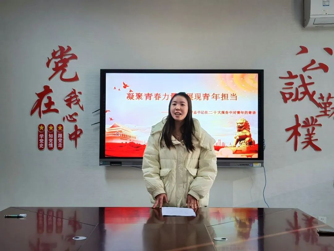崔艳文以《凝聚青春力量,展现青年担当——深刻领悟习近平总书记在二十大报告中对青年的寄语》为题,号召同学们将个人前途和时代发展紧密联系起来,把个人理想奋斗融入民族复兴伟业,珍惜光阴、不负韶华,以过硬本领展现作为,携手在新时代新征程上留下奋斗的青春足迹。