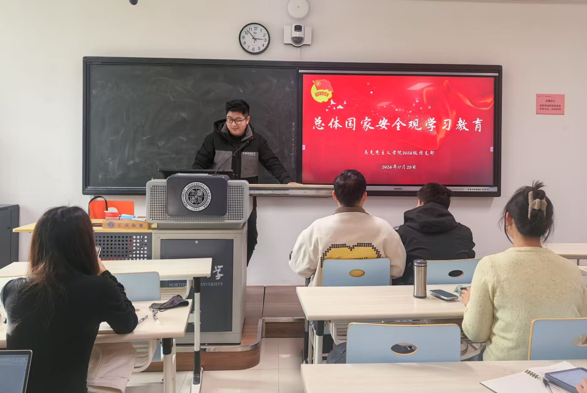 活动伊始,安晨阳讲述了习近平总书记关于总体国家安全观的重要论述,帮助同学们理解总体国家安全观的内涵与外延。随后,他带领同学们观看了以《创新引领·国安砺剑》为题的国际安全教育视频,并通过案例分析的方式使同学们深刻领悟到了总体国家安全观的重要性,增强了同学们的忧患意识。