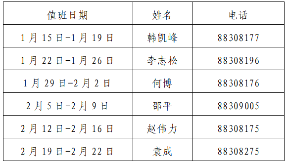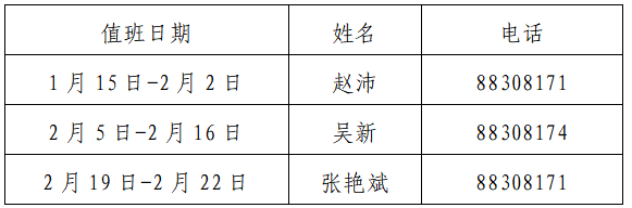 1.值班时间为每天(周六、日除外)上午9:00至11:30,下午2:30至5:00。2月9日至2月17日(除夕至正月初八),不安排在岗值班。值班期间,带班领导、值班人员须保持24小时电话畅通。遇到不能处理的事项,须及时联系学院领导或相关工作人员。