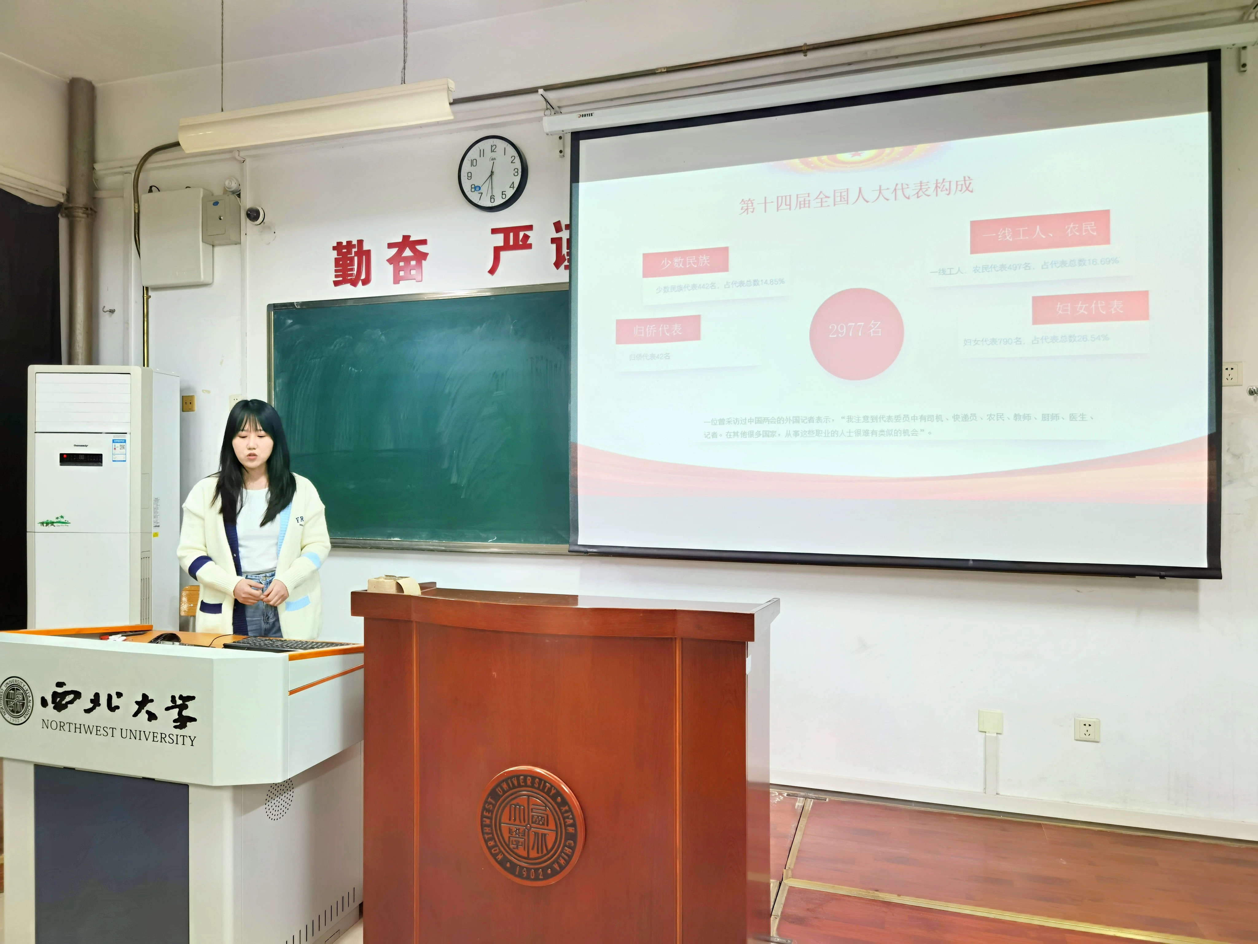 李雨潇以“读懂2023全国两会”为题,回顾了李强总理答中外记者问要点,并带领大家学习了2023全国两会的热词学习笔记。全国两会作为人民群众高度关注的会议,能够集中地反映人民群众的心声和需求,通过这一次的宣传和学习,进一步深化了同学们对于全国两会的理解程度,切身体会到了我国民主政治的优越性。