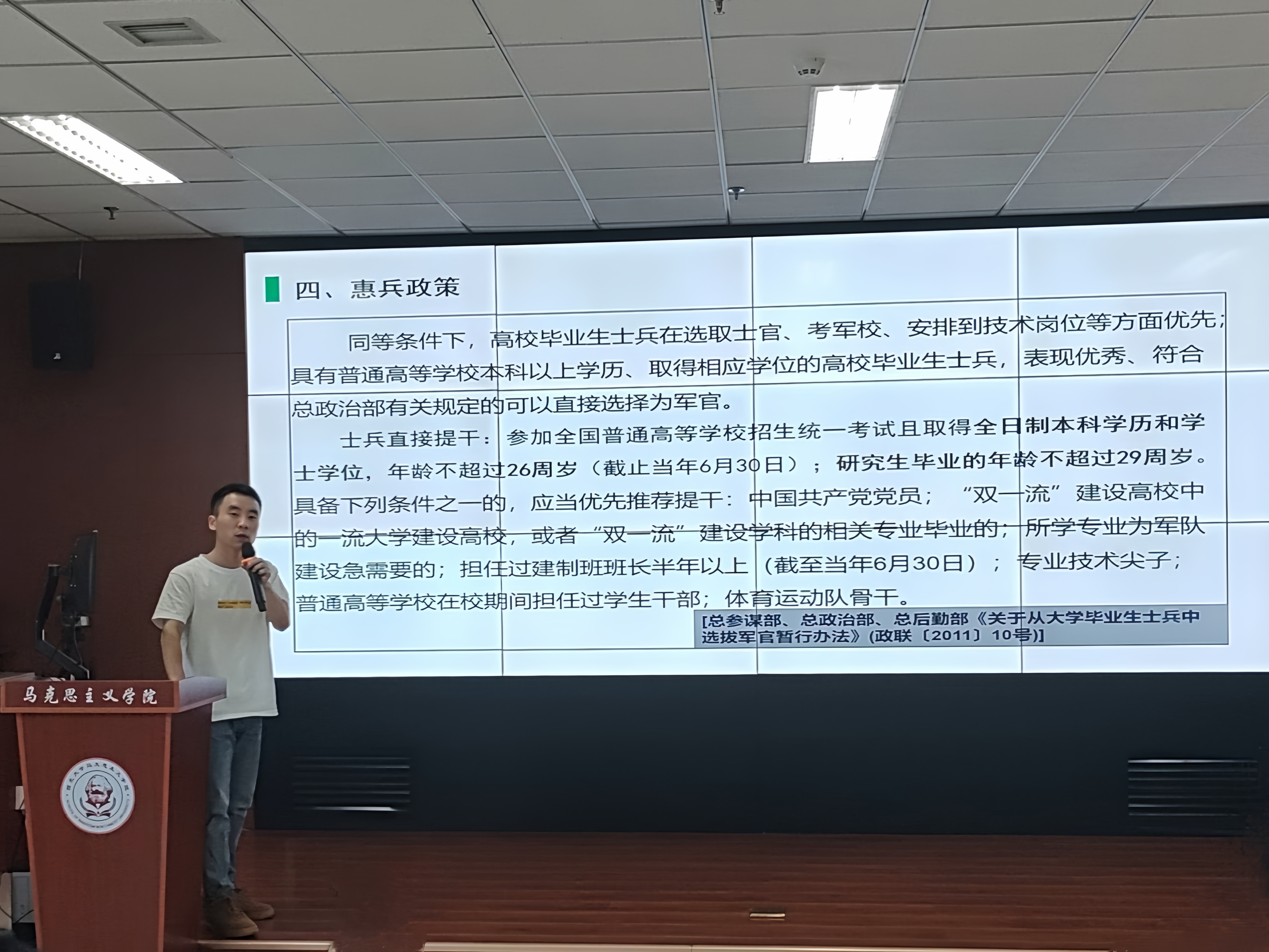 2023年6月13日下午,pg电子中国官方网站开展“执笔为戈,筑梦军营”征兵政策宣讲会。宣讲会由pg电子官网退伍大学生士兵、2022级硕士研究生刘志晨主持。