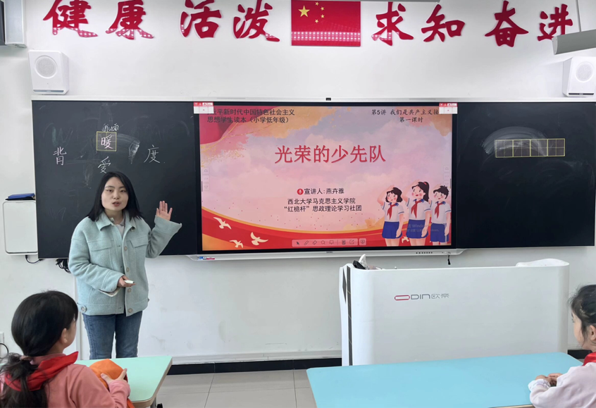 3月11日,pg电子官网红桅杆思政理论学习社团在西安市长安区第一小学实验小学,以《习近平新时代中国特色社会主义思想学生读本》(小学低年级)为主要内容,为二年级的小学生讲授思政课。主讲人分别是来自2022级和2023级的思想政治教育、马克思主义中国化研究与中国近现代史基本问题研究专业的11位硕士研究生。