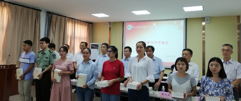 接下来学院领导、老师为在座的40多位新生赠与西大党委提供的教材书籍,这些书籍体现了西大对新生的亲切关怀,寄托着学校对新生刻苦学习、常学常新的殷切期望。