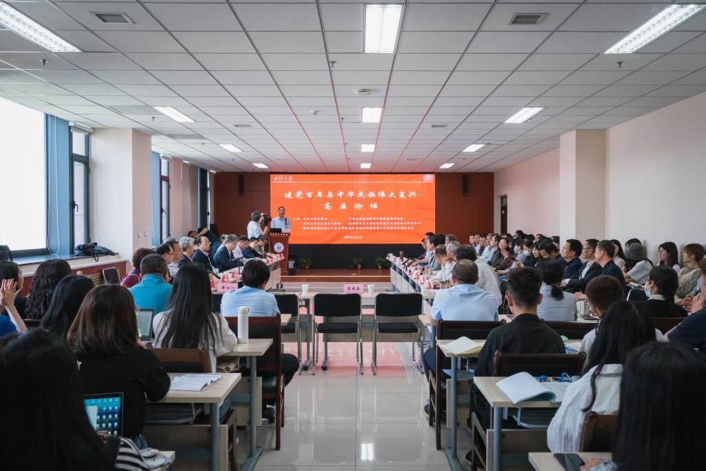 主题发言阶段:八位专家先后发言。林绪武以“党报党刊的百年发展”为题,论述了党的成立至土地革命时期、抗日战争至解放战争时期、新中国时期等三个阶段党报党刊的发展历程,提出党报党刊是中国共产党的记录者、见证者的观点。姚金果以“中国共产党的初心是什么”设问,提出陈独秀在《新青年》宣言中宣誓的“我们理想的新时代新社会,是诚实的,进步的,积极的,自由的,平等的,创造的,美的,善的,和平的,相爱互助的,劳动而愉快的,全社会幸福的”话语,正是中国共产党的初心的文本证据。陈鹏鸣通过对人民出版社词义学和历史学考察,提出人民出版社是中国共产党的伟大创造、人民出版社的宗旨是全力宣传马克思主义及推动思想认同、人民出版社的质量追求是“两个务必”“四个必须”等观点。高尚斌研究了百年中国共产党攻坚克难创造辉煌基本经验,分别是坚定信仰、勇敢斗争,实事求是、路线正确,理论创新、思想指引,为民谋利、赢得人民,党员带头、英模辈出,领导坚强、团结统一等六条宝贵经验。马启民以“中国共产党走自己的路的理论与中华民族的伟大复兴”为题,分别从中国道路与中华民族的伟大复兴、中国道路探索的三个阶段、中共走自己的路的理论进行论述,总结出中国道路的四个特征、探索的三个阶段以及毛泽东、邓小平、习近平等三位领袖对走自己的路的理论构建和贡献。柳建辉分析了百年中国共产党的历史性贡献,强调要洞悉党的领袖重要讲话背后的文本内涵,从救国、建国、富国、强国等四个方面透视党的百年贡献。李良明通过对中国共产党成立的历史事实的考证,驳斥了历史虚无主义者妄言否定党的成立的必然性,提出在党史研究中要坚持正确的党史观,抵制历史虚无主义。付建成以“延安时期推进马克思主义中国化的基本经验”为题,详细论证了以全党上下理论学习作为重要突破口、以理论联系实际学以致用为基本原则方法,以细致周密调查研究为重要桥梁,以继承和弘扬优秀传统文化为文化基础等四条宝贵经验。八位专家教授的精彩发言赢得了在场师生的热烈掌声。